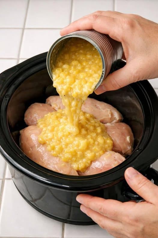 Add Corn: Open the cans of cream style corn and dump them evenly over the chicken breasts, spreading the corn so the chicken is mostly covered.
