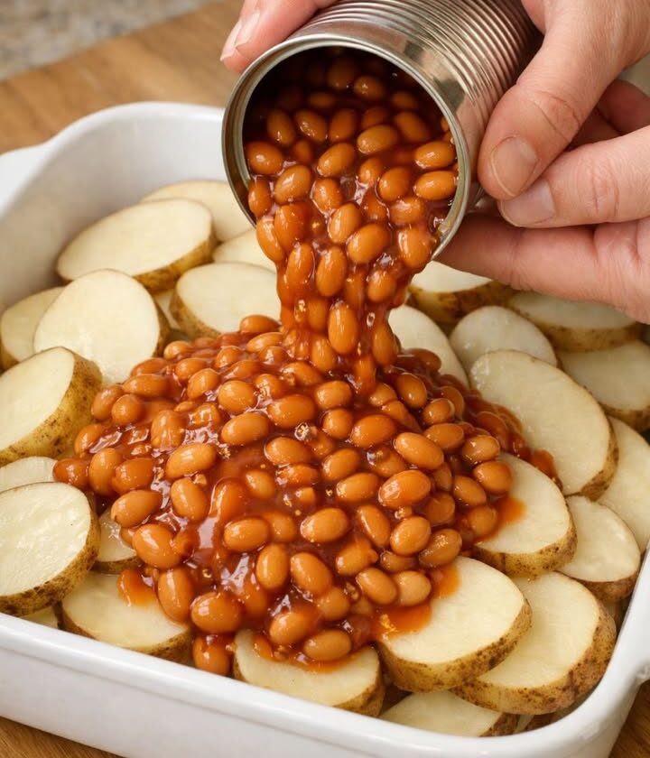 To keep the spirit of a four-ingredient, dump-and-bake supper, think in terms of simple swaps rather than adding lots of extras. For a smokier flavor, use canned baked beans labeled “hickory” or “maple and bacon,” or stir a teaspoon of smoked paprika into the beans before you pour them over the potatoes. If cheddar isn’t your favorite, swap in Colby Jack, Monterey Jack, or a smoked cheddar for more depth. You can also change the potatoes: Yukon Golds will hold their shape a bit better and give you a creamier texture, while keeping the same method of layering raw slices and dumping the beans over. For a slightly lighter version, use reduced-fat cheese and choose baked beans with less sugar; the casserole will still be comforting, just a bit less sweet and rich. If you need to make it ahead, assemble the dish up through layering the potatoes and beans, cover, and refrigerate for up to 8 hours; add about 10 extra minutes to the covered baking time to account for the chill. Leftovers reheat well in the oven or microwave and make an easy lunch the next day.