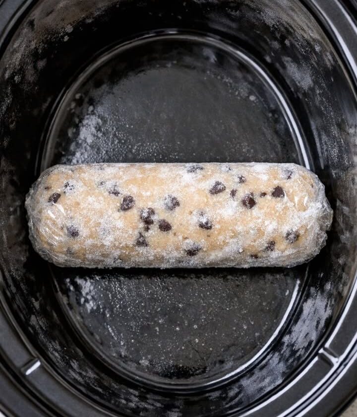 - Place the entire frozen raw cookie dough log in the bottom of the slow cooker. It should sit in the center; no need to slice or thaw it. The dough will soften and spread as it cooks.