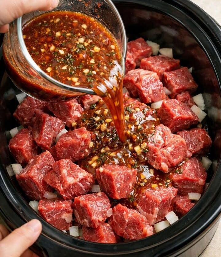 Instead of the traditional multi-step French method, this version keeps things simple. You just place raw beef chuck into the slow cooker and drizzle one rich mixture of red wine, beef broth, tomato paste, garlic, and thyme over the top. As it cooks low and slow, the flavors deepen and the beef becomes incredibly tender.