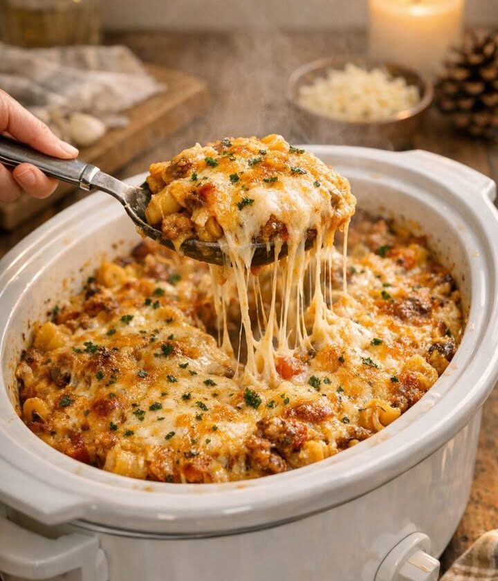 For a more browned, bakery-style top, once the pasta is done you can carefully lift out the slow cooker insert (if it’s oven-safe) and place it under a preheated broiler for 3 to 5 minutes, watching closely, until the cheese is deeply golden and starting to blister. Let it sit on a heatproof surface for at least 10 minutes before serving so the casserole can set slightly.