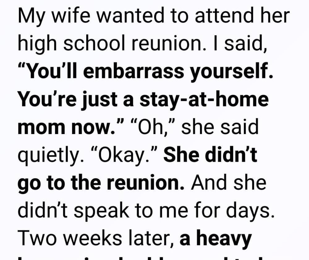 No argument. No tears. Just silence. She turned back to the sink. And she didn’t go to the reunion.