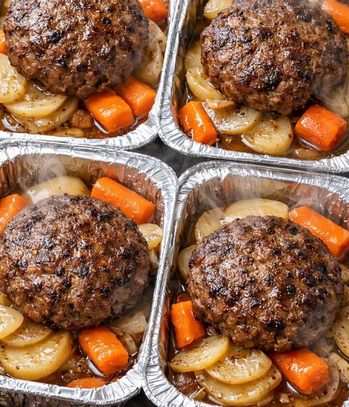Divide the seasoned ground beef into 4 equal portions. Shape each portion into a thick, flat patty about the size of your palm, then lay one patty on top of the vegetables in each foil tray. Press lightly so the patty rests firmly on the potatoes and carrots but still holds its shape.