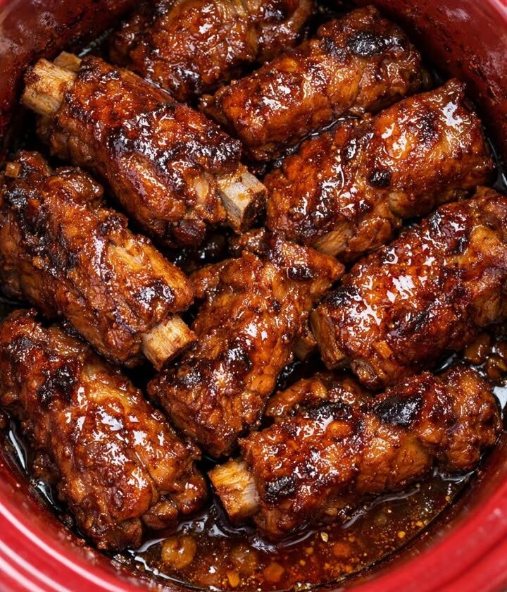 Serve the ribs hot, spooning more of the rich amber sauce from the slow cooker over each portion. The meat should be fall-off-the-bone tender, with glistening caramelized edges and plenty of sauce pooling on the plate.