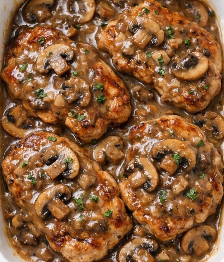 Serve these creamy mushroom pork chops straight from the casserole dish with something that can catch every bit of the gravy. Mashed potatoes are the obvious choice, but buttered egg noodles, rice, or even a crusty baguette work beautifully. A simple green side—steamed green beans, roasted broccoli, or a crisp salad with a sharp vinaigrette—helps balance the richness. If you enjoy wine, a light-bodied red like Pinot Noir or a dry white like Pinot Grigio pairs nicely with the earthy mushroom sauce.