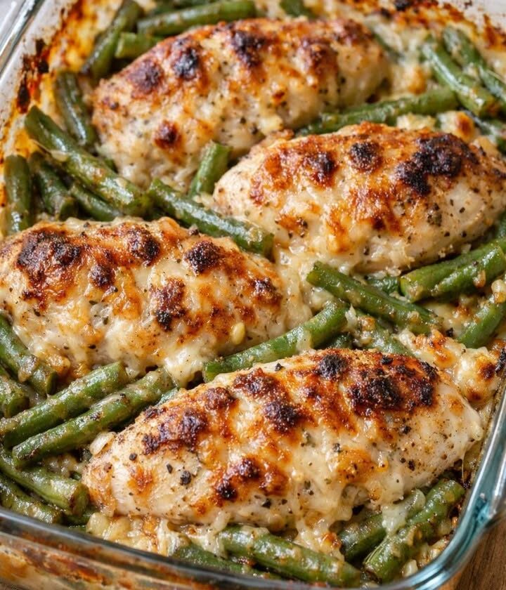 Serve this chicken and green bean bake straight from the glass dish while it’s still bubbling around the edges. It’s wonderful over a scoop of fluffy mashed potatoes or buttered egg noodles to catch the savory juices. A simple side of sliced tomatoes or a crisp lettuce salad with a light vinaigrette balances the richness. If you like, add a basket of warm dinner rolls or buttered bread to soak up every last bit of the sauce.