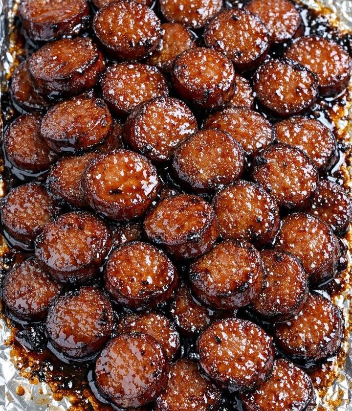 Serve the caramelized kielbasa warm right on the foil-lined tray or in a shallow serving dish with toothpicks for easy grabbing. It pairs well with other potluck classics: creamy coleslaw, potato salad, baked beans, or a crisp green salad to balance the sweetness. For a more substantial spread, offer soft dinner rolls or slider buns so guests can make mini sandwiches, and round things out with a simple veggie platter and something tangy—like pickles or pickled peppers—to cut through the rich, sticky glaze.