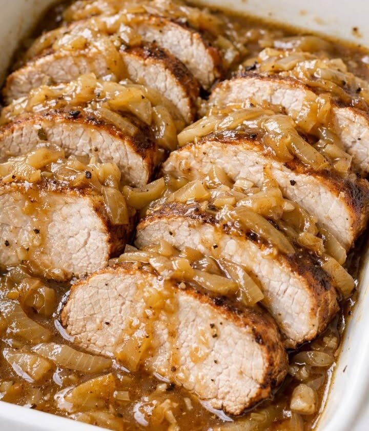 Serve the sliced pork straight from the white casserole dish, generously spooning the savory onion gravy over each portion.
