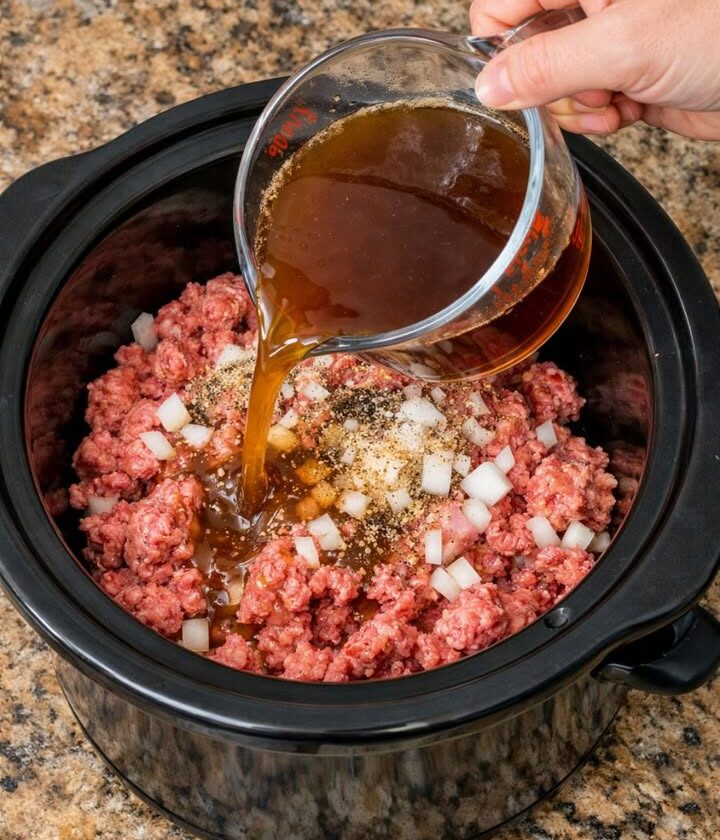 Pour beef broth over ground beef, together with 3 ingredients, into slow cooker for a comforting dinner that’s my default when I don’t know what to make