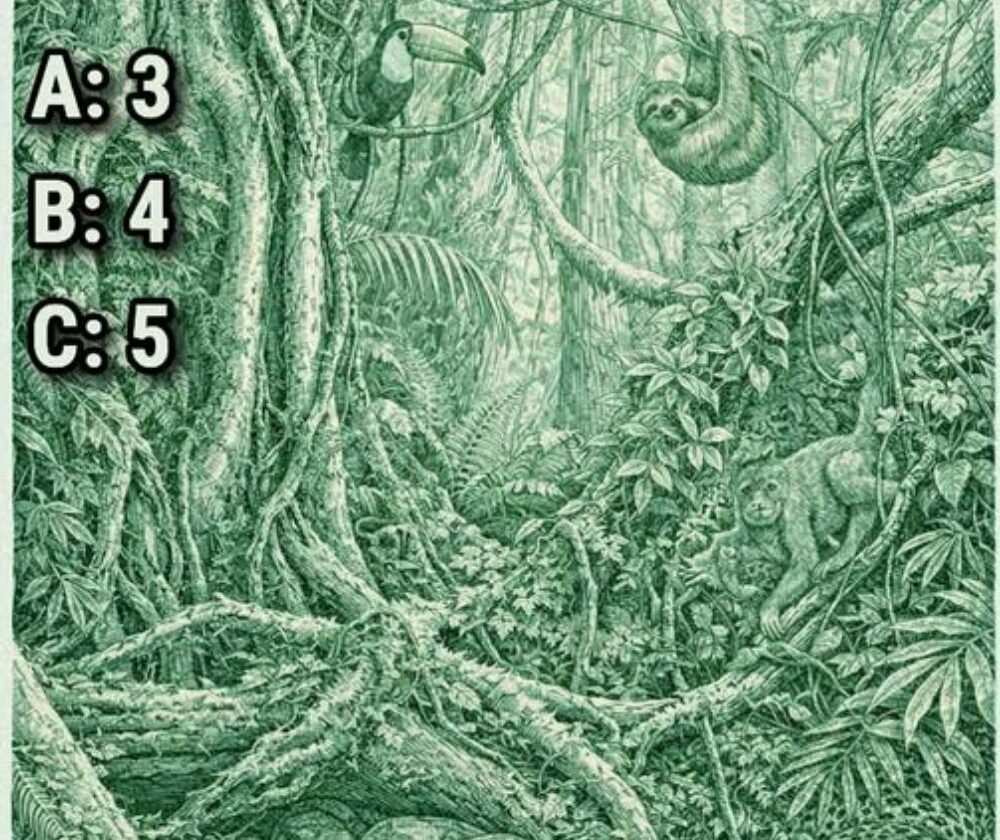At first glance, this lush jungle illustration looks like nothing more than a dense forest scene—twisting roots, hanging vines, and a canopy of layered leaves. But hidden within the foliage are several camouflaged animals waiting to be spotted.