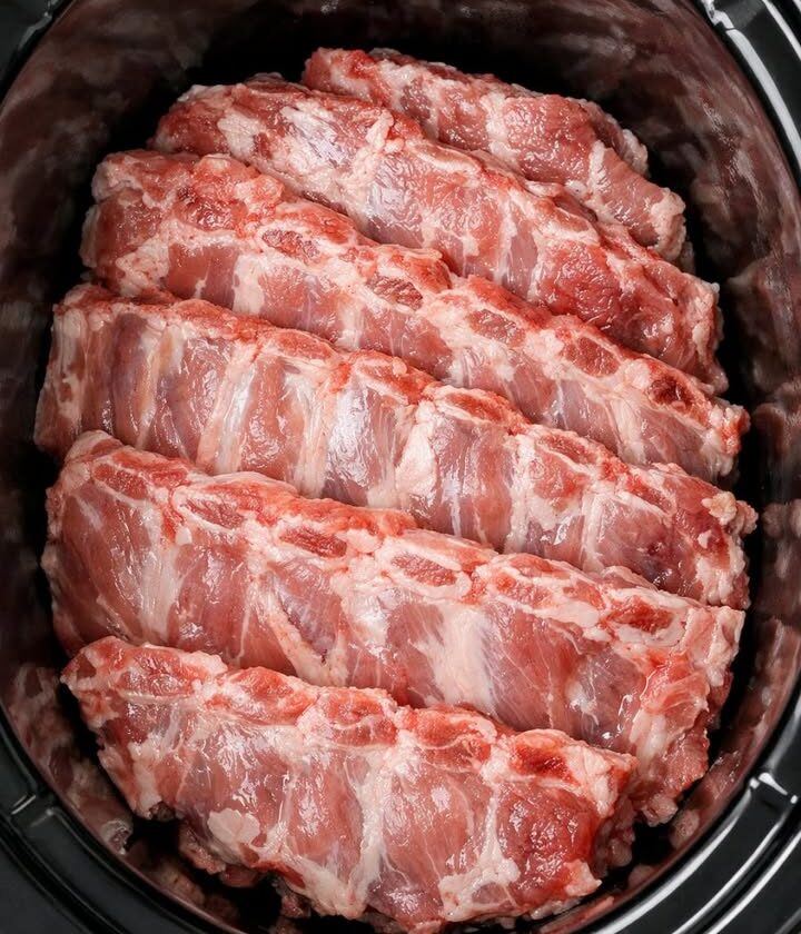 - Place the raw rib sections in a single, snug layer in the bottom of your slow cooker, meaty side facing down as much as possible. It’s fine if they overlap a bit, but try to keep them mostly in one layer so the heat and sauce can reach everything.